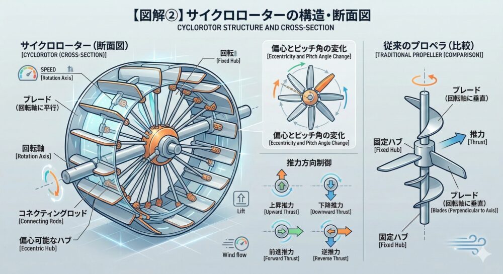 サイクロローターの構造を一言でまとめると、「回転軸に平行に配置された複数のブレードが、円筒状の軌道を描きながら回転し、1回転のあいだにブレードの傾き(ピッチ角)を連続的に変化させる」という仕組みです。