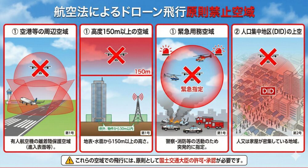 航空法は、航空機の航行の安全や、地上の人・物件の安全を損なうおそれがあるとして、以下の空域でのドローン飛行を原則禁止している。
