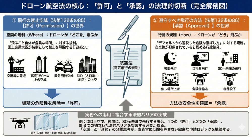 航空法が「許可」と「承認」をわざわざ別の条文(第132条の85と第132条の86)に分けて規定しているのには、極めて論理的な理由がある。この法理的構造(メカニズム)を理解しないまま申請書を作成することは、目隠しをして地雷原を歩くようなものだ。