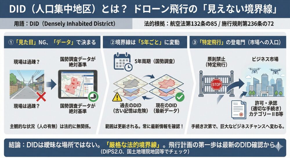 実務においては、飛行計画を立てる際、DIPS2.0等のシステムや国土地理院の地図等を用いて、対象エリアが最新のDIDに該当するか否かを第一に確認することが、すべての法的ロジックの出発点となる。