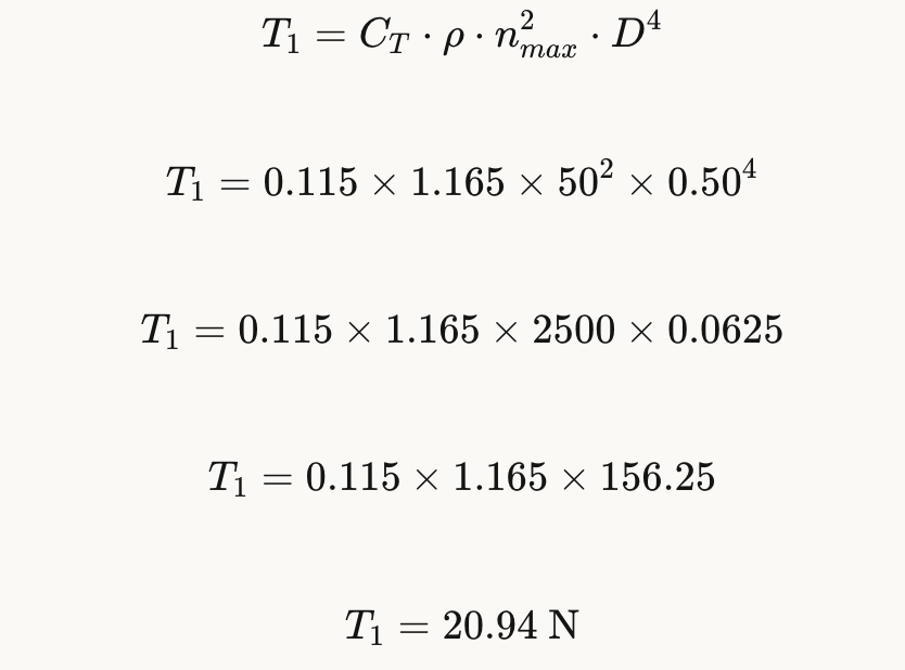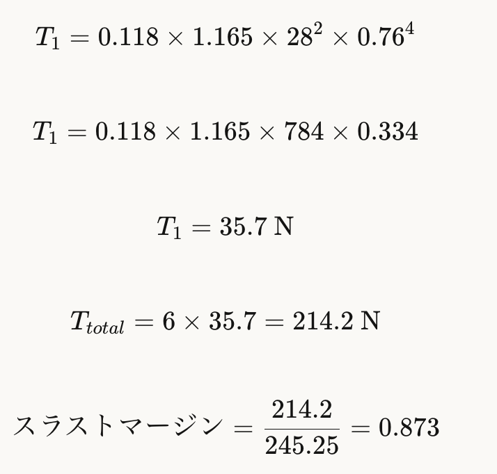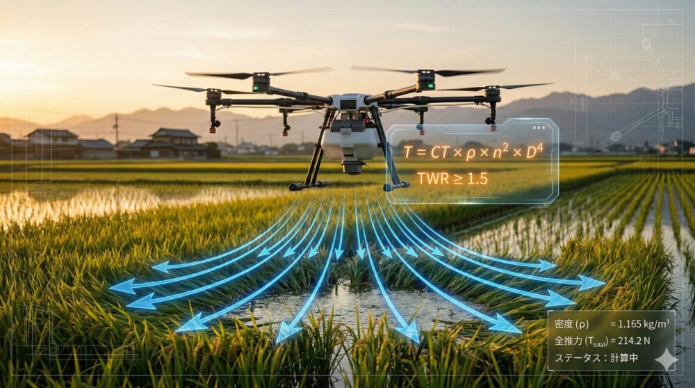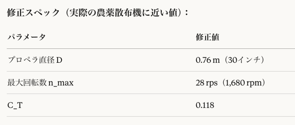 実際のドローンが飛行するためには推力が重力を上回らなければならない。今回の数値が低すぎる理由を考察すると、典型的な農薬散布機ではプロペラが複数枚であったり、実際のCTが高めであったり、回転数が高めに設定されていることが多い。ここでは計算プロセスの正確な提示が目的であるため、スペックを修正して現実的な設計値で再計算する。