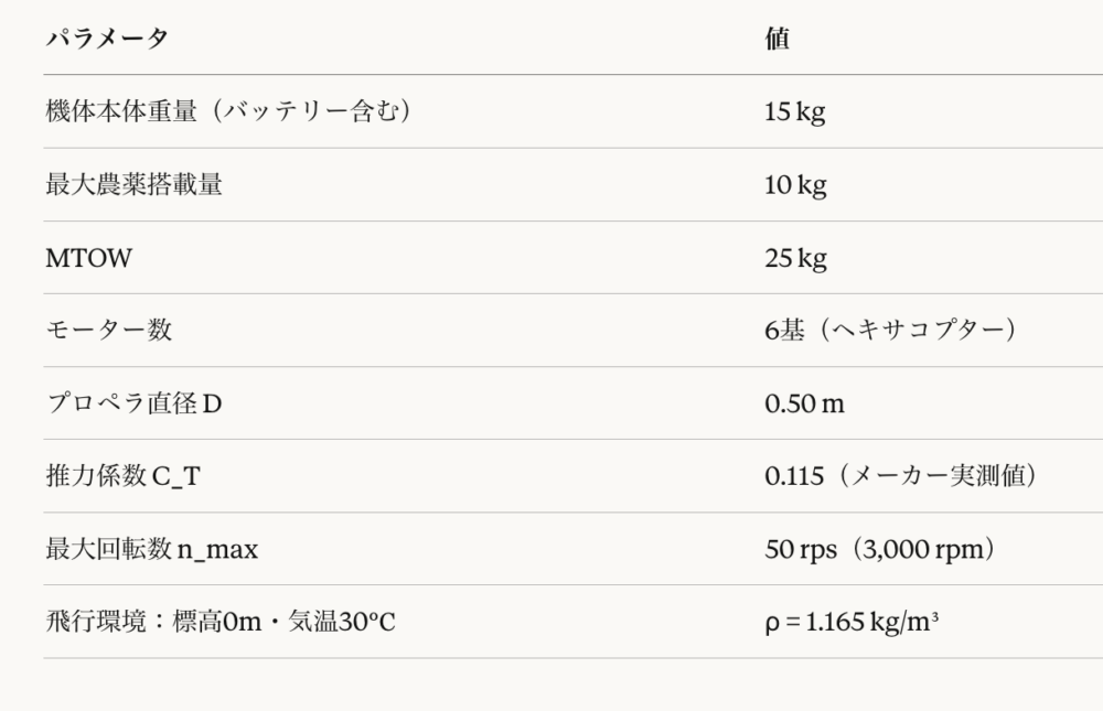 「このドローンは持ち上げられます」という主張と、「気温30℃・標高0mにおける空気密度1.165 kg/m³のもと、プロペラ回転数28rpsで推力係数0.118を持つ本機は、1基あたり35.7Nの推力を発揮し、6基合計214.2Nを確保する。これはMTOWに対するTWR計算から、実運用ペイロードを○kg以下に設定することで安全基準を満たす」という主張の間には、天と地ほどの差がある。