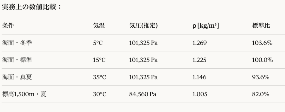 空気密度ρは理想気体の状態方程式(第33回で詳述)から導出されるが、実務的には以下の近似式を用いる。