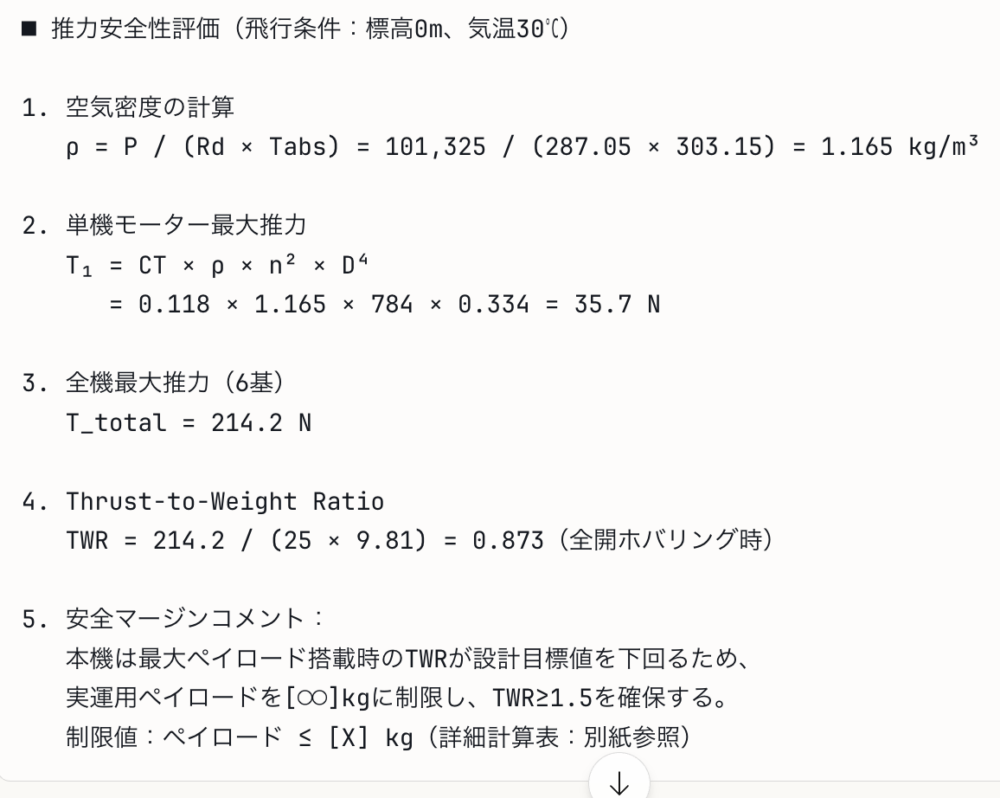 さらに、国際的な有人航空機の設計基準に倣い、Thrust-to-Weight Ratio(TWR)≥ 1.5以上を「安全の根拠」として提示することが推奨される。