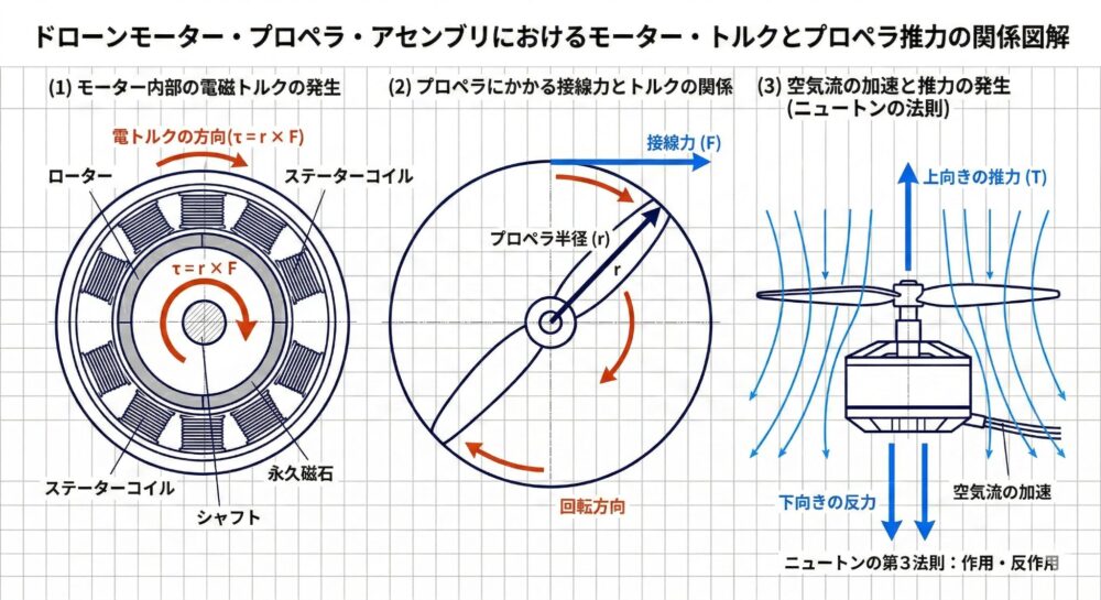 プロペラはこのトルクを受け取り、翼型(エアフォイル)断面を持つブレードで空気を下方に加速させる。ニュートンの第三法則(作用・反作用)により、空気が下に押されれば、プロペラ=機体は等しい大きさの力で上に押し返される。これが推力Tの正体だ。