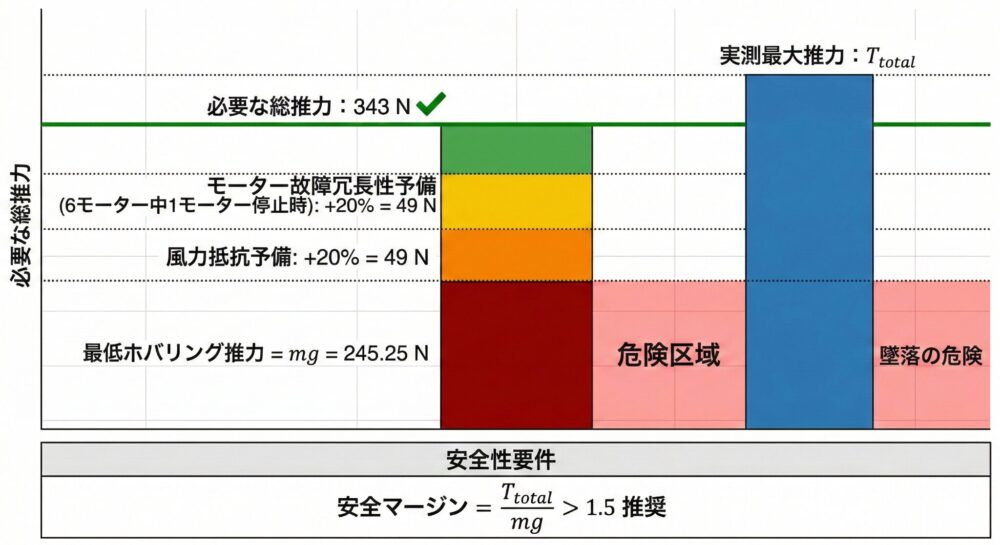 機体が静止(ホバリング)するためには、全推力の合計=重力(mg)でなければならない。上昇するためには、全推力 > mgでなければならない。この単純な不等式が、「安全に持ち上げられるか」の判定基準となる。