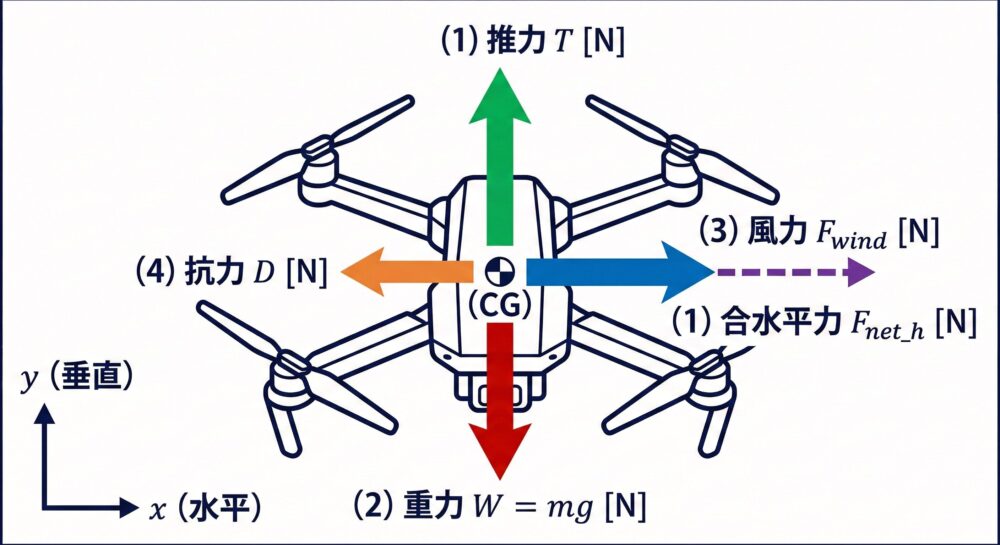 空中を飛行するドローンには、常に複数の力が同時に作用している。$F = ma$ を正確に適用するためには、まずこれらを漏れなく「ベクトル」として整理する必要がある。