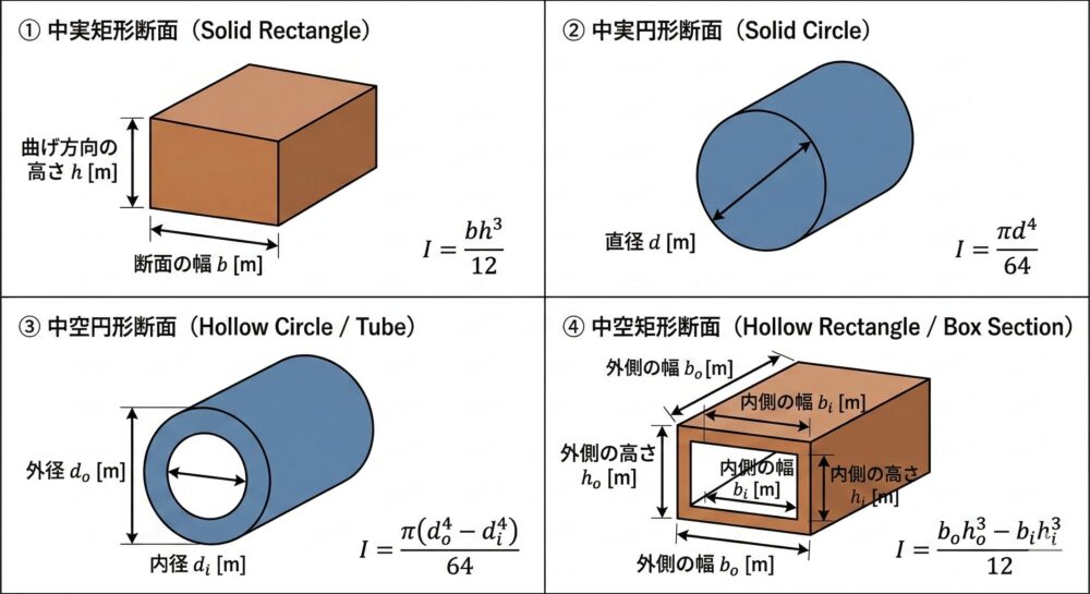 $$I = \frac{bh^3}{12} \quad \text{(矩形断面の場合)}$$