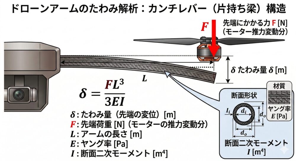 ドローンのアーム(モーターマウントアーム)は、中央ボディから片持ち梁(カンチレバー)として突き出している。この構造のたわみ量 $\delta$ は、材料力学の基本式から求められる。