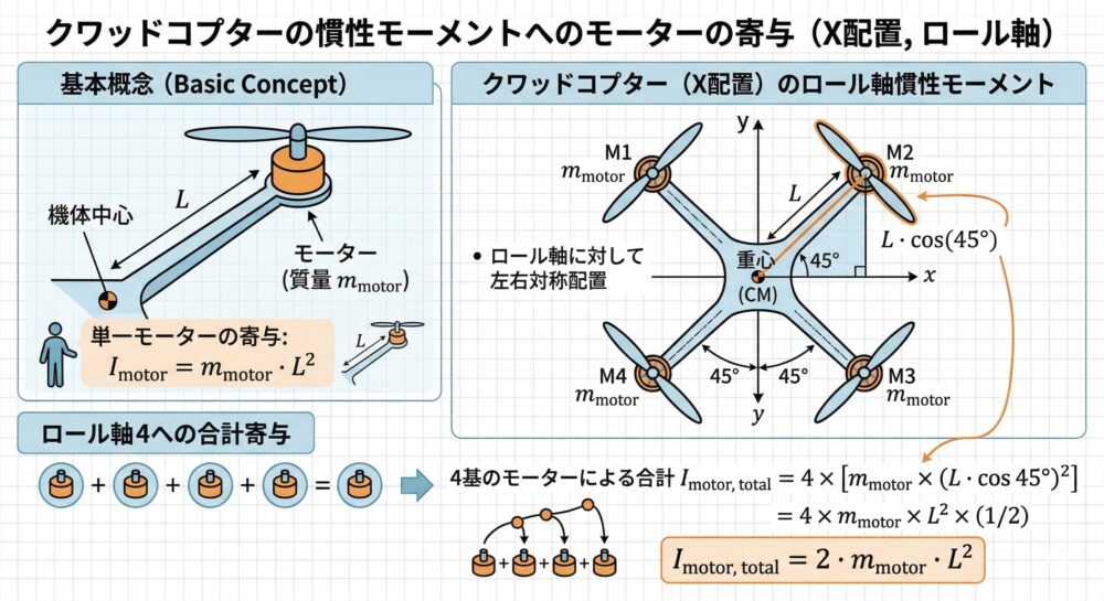 クワッドコプターの場合、ロール軸まわりには左右各2基のモーターが対称配置されるため(X配置の場合は $L \cdot \cos 45°$ の補正が入る)、この項が複数個加算される。