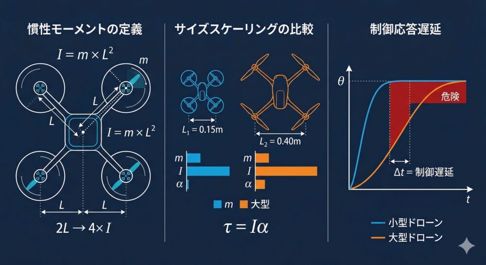 これが意味することは深刻だ。機体のアームが長い大型機は、同じ質量の小型機と比較して、慣性モーメントが桁違いに大きくなる。慣性モーメントが大きいということは、モーターの推力変化(トルク入力)に対する姿勢変化の応答が遅い——すなわち制御遅延が増大するということだ。