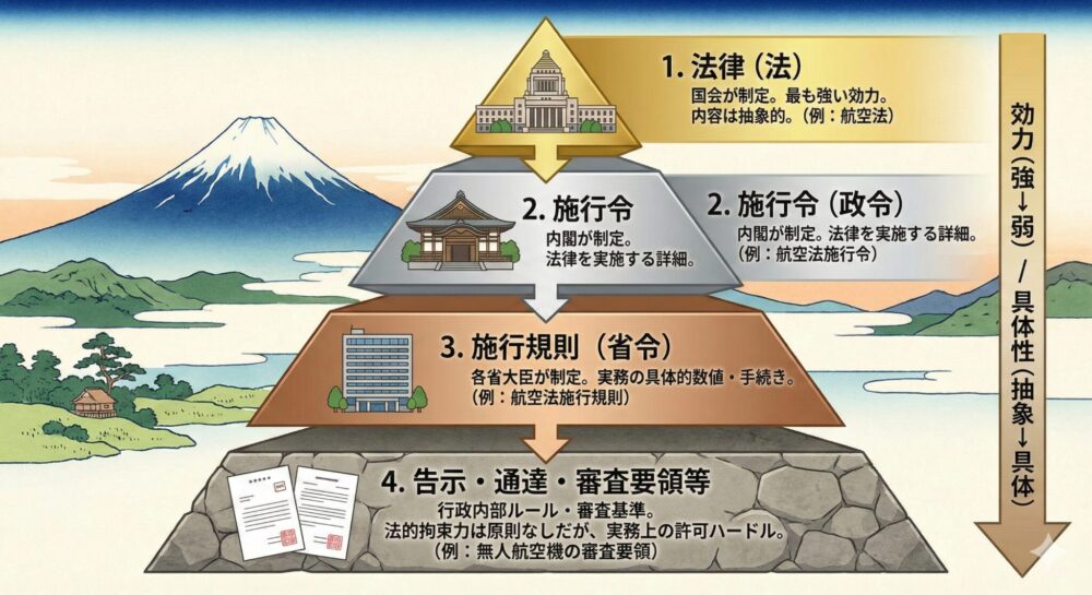 「法令のピラミッド」という法学の基礎概念を、実際のドローン規制(航空法・施行規則・審査要領)にどう当てはめ、行政との非対称戦を制するための「実務の武器」としてどう使いこなすか。その冷徹なメカニズムと戦術を解剖する。