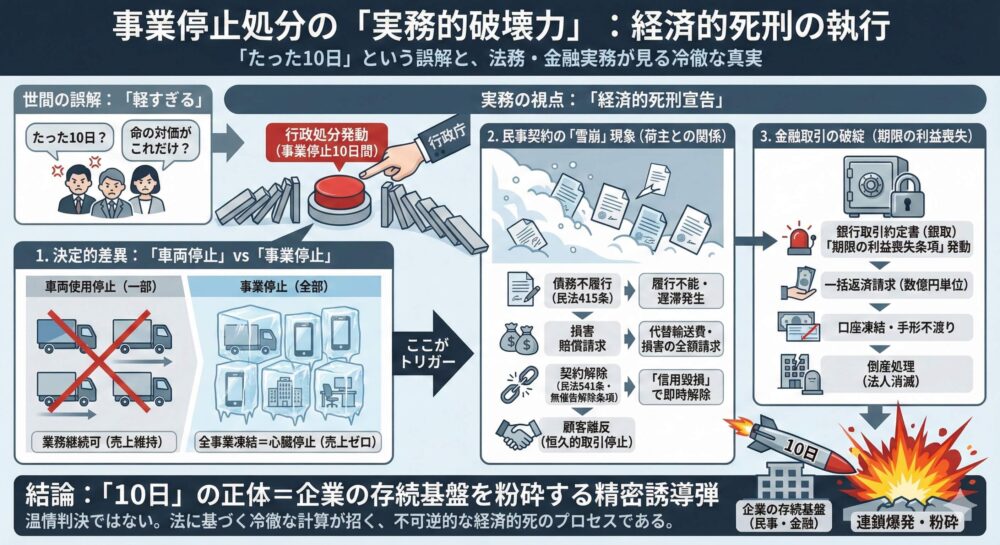 世間は「人の命が失われて、たった10日の営業停止か」と憤る。しかし、法務と金融の実務を知る者にとって、この「10日間の事業停止」という行政処分は、長期の懲役刑よりも遥かに残酷な、法人に対する即時の「経済的死刑宣告」に他ならない。
