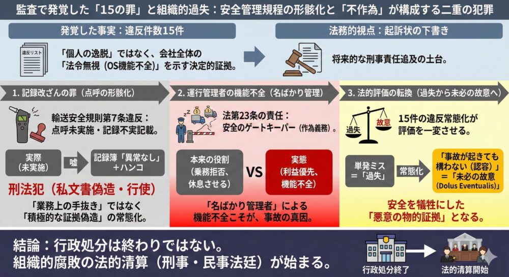 点呼記録簿は、運送事業者が安全確保義務を履行したことを証明する重要な「事実証明に関する文書」である。これを組織的に偽造していたのであれば、それは「業務上の手抜き」ではなく、「積極的な証拠偽造」という犯罪スキームが社内に常態化していたことを意味する。
