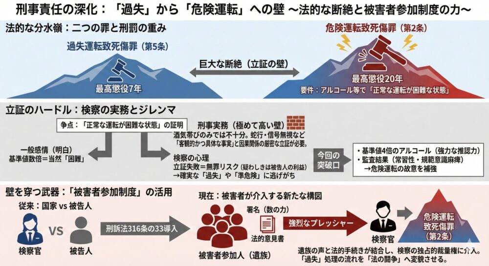 検察という堅牢な官僚組織を動かし、危険運転致死傷罪への訴因変更を検討させるに至った最大の駆動力は、遺族による活動と、刑事訴訟法に規定された「被害者参加制度」の活用にある。
