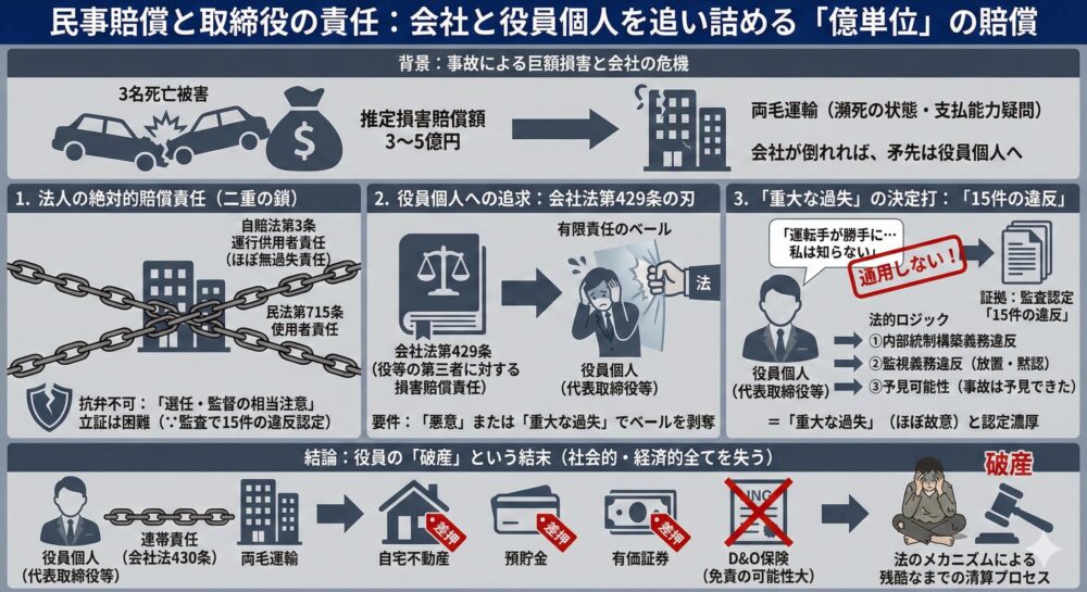 本件の最大の法的焦点は、ここにある。会社が賠償しきれない場合、あるいは会社が倒産した場合、遺族は会社法第429条第1項に基づき、代表取締役を含む役員個人に対して損害賠償を請求することになる。