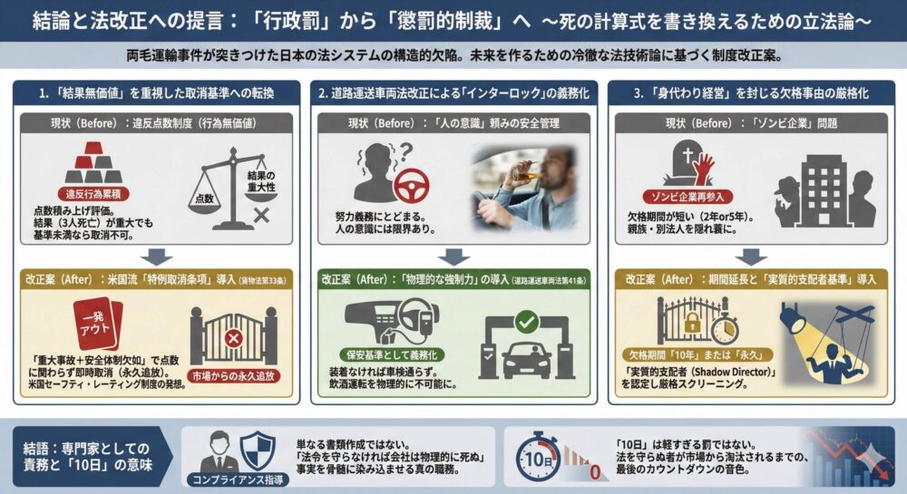両毛運輸事件が我々に突きつけたのは、一企業のモラル欠如という矮小な問題ではない。「3人の死」という取り返しのつかない結果に対し、現行の行政法制が「10日間の事業停止」という回答しか用意できなかった、日本の法システムの構造的欠陥である。