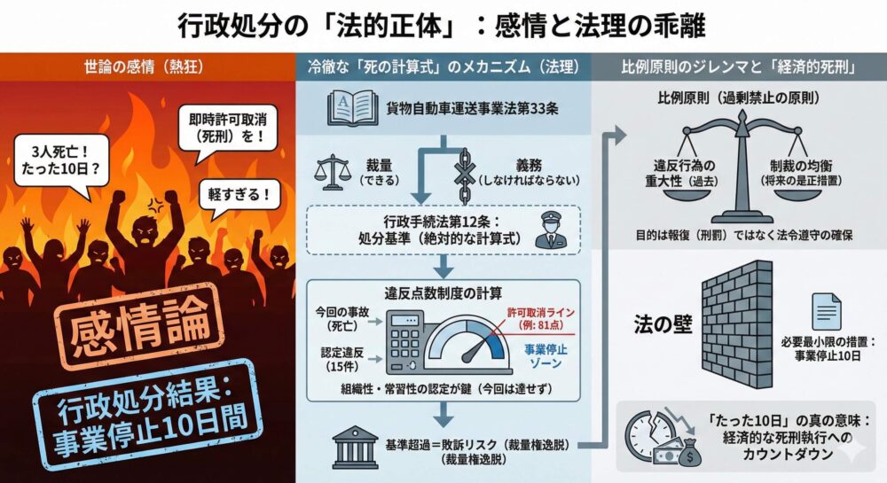 3人の死という結果の重大性は計り知れないが、行政処分はあくまで「将来の法令遵守を確保するための手段」であり、過去の行為に対する「報復(刑罰)」ではない。行政庁は、「事業停止10日」という期間が、法違反の是正措置として「必要かつ最小限度」であるという法的判断を下さざるを得なかったのだ。