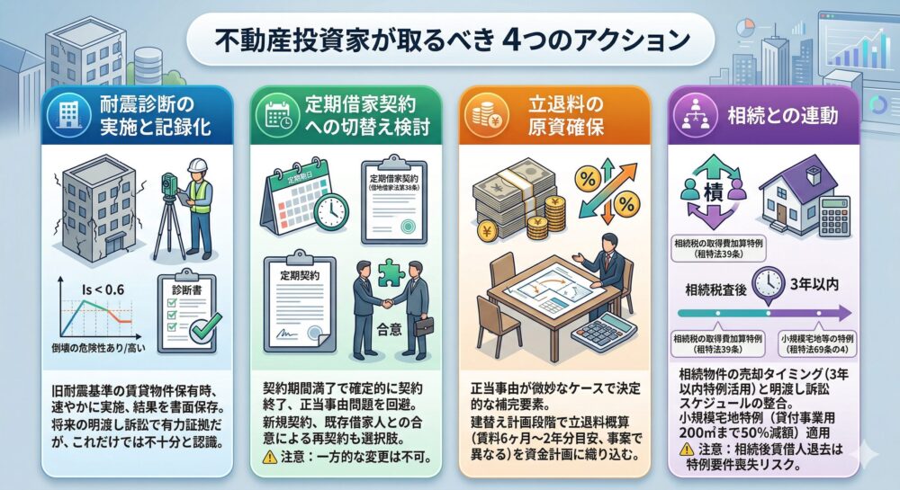 不動産投資家にとっては、正当事由の不確実性を前提としたリスク管理が不可欠である。定期借家契約の活用、耐震診断の早期実施、立退料の原資確保といった具体的な対策を講じるとともに、宅建業法改正によるデジタル化の恩恵を活用して契約管理の効率化を図ることが求められる。実務家としては、法務省報告書の詳細な分析結果を自身の案件に引きつけて読み解き、訴訟戦略や紛争予防に活かしていただきたい。