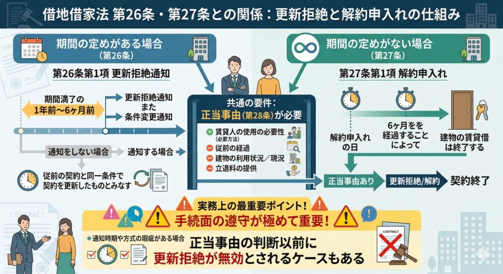 期間の定めがある場合は第26条の更新拒絶通知、期間の定めがない場合は第27条の解約申入れという手続的な枠組みの違いがあるが、いずれの場合も第28条の正当事由が必要とされる点は共通である。実務上、通知の時期や方式の瑕疵により、正当事由の判断以前に更新拒絶が無効とされるケースもあるため、手続面の遵守も極めて重要である。