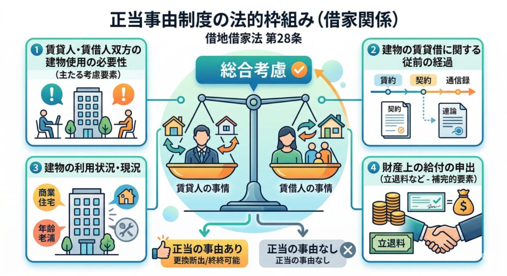 この条文は、①賃貸人・賃借人双方の建物使用の必要性(主たる考慮要素)、②賃貸借の従前の経過、③建物の利用状況・現況、④立退料等の財産上の給付の申出(補完的要素)を総合考慮する構造をとっている。